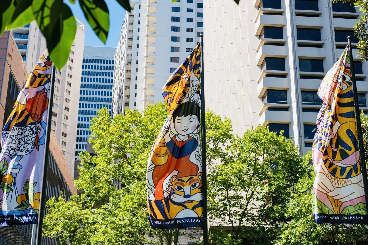 Five Asian–Australian artists share what the Year of the Tiger means for them in a series of colourful, bright and engaging banner artworks displayed on our outdoor banner galleries, commissioned by The City of Sydney. The Guardian series; I want to create a whimsical and kitschy visual for the hope to welcome the start of the new year; Each Tiger on the artwork is full of life and strength and embodies the energy and drive to achieve and progress. The symbolism of the Tiger in Chinese culture is as diverse as the majesty creature itself. In Chinese folklore, the Guardian tiger is believed to be a powerful creature because it can keep away from the three major disasters that affect households: fire, thieves, and evil spirits and to be able to protect children and heal ill patients.